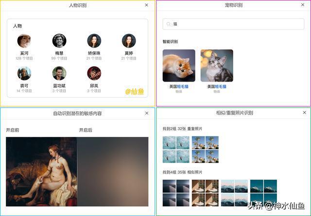 除了前面提到过成功率很高的人脸识别外,绿联的相册也拥有宠物识别、相似/重复照片识别、潜在敏感内容识别(赤身裸体模糊化)等功能: