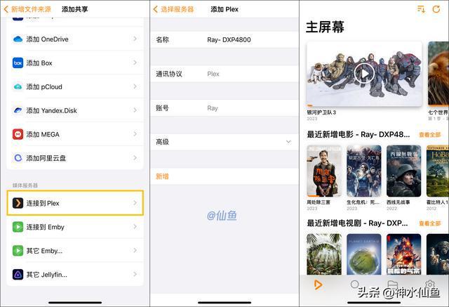 在infuse端,点击新增文件来源并添加共享,选择「连接到Plex」:
