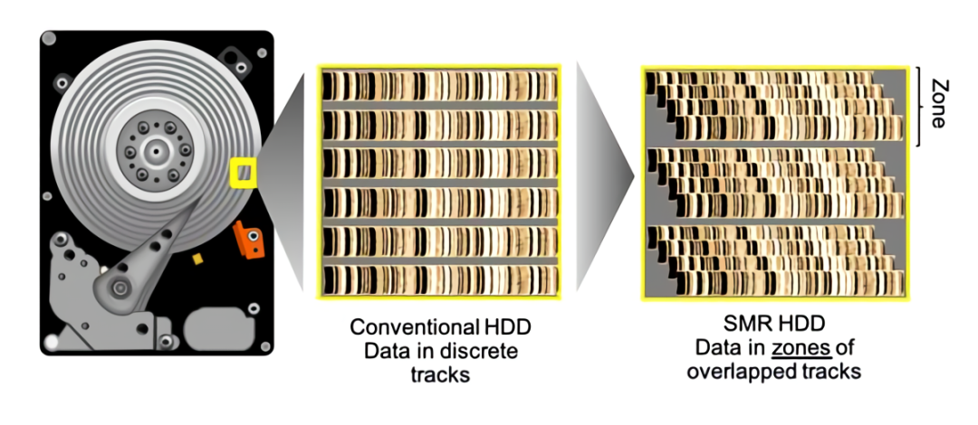 这部分网上科普太多了,细说起来五千字都肝不完,由于不是本文核心,所以这里就简单说下。由于磁盘自身的结构不同,PMR(垂直式硬盘)的存储密度低,越是大容量(1T以上)的制造成本越高,而SMR(叠瓦式硬盘)的存储密度高,越是大容量(1T以上)越能节省成本,这是两者在自身构造上的差异。