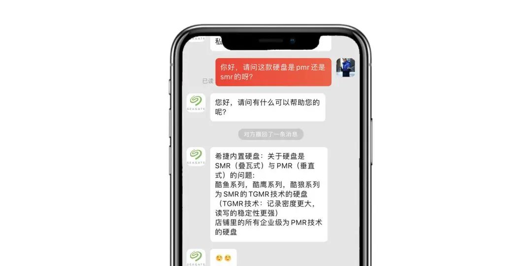 当然行,前提是客服愿意告诉你的话。以上聊天发生于2020年4月,客服的统一口径是:“酷鱼,酷鹰,酷狼系列,均为SMR的TGMR技术的硬盘。” 而中间一条“对方撤回了一条消息”,内容则是:“目前没有收到厂家的资料,所以无可奉告”之类的回复。