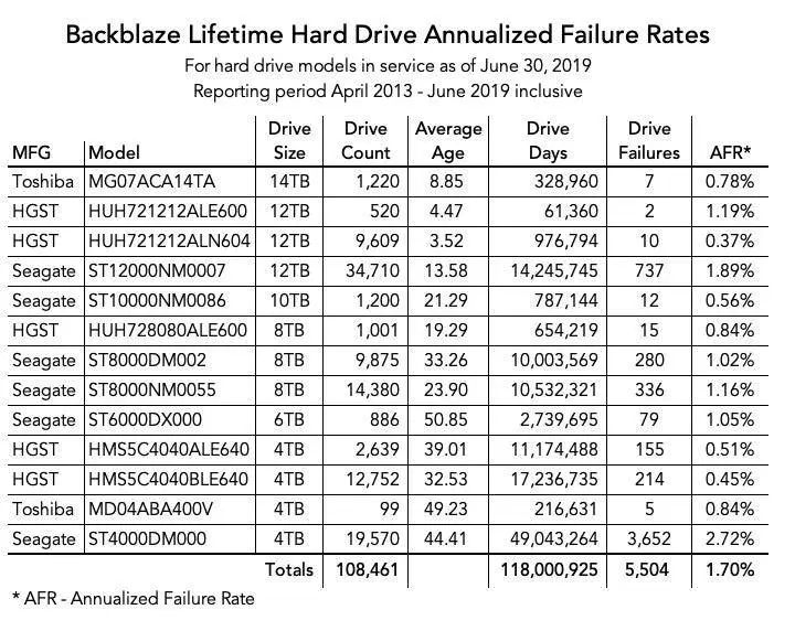 “好”这个词很笼统,性能大家都差不多,主要看故障率了,下面是数据存储厂商Backblaze,发布的2019年度硬盘故障率报告,也许我们可以从中一看端倪。