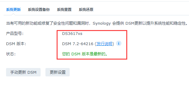 我这里用来测试的群晖Nas系统型号及版本号为:DS3617xs-DSM 7.2-64216