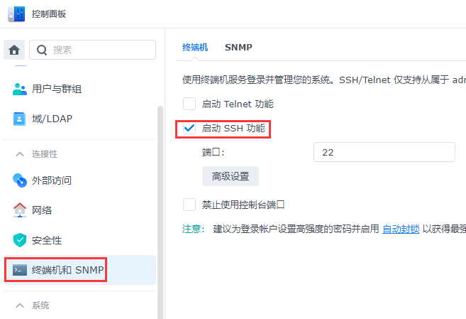 打开“控制面板”—-“终端机和snmp”—-“启用ssh功能” 应用保存
