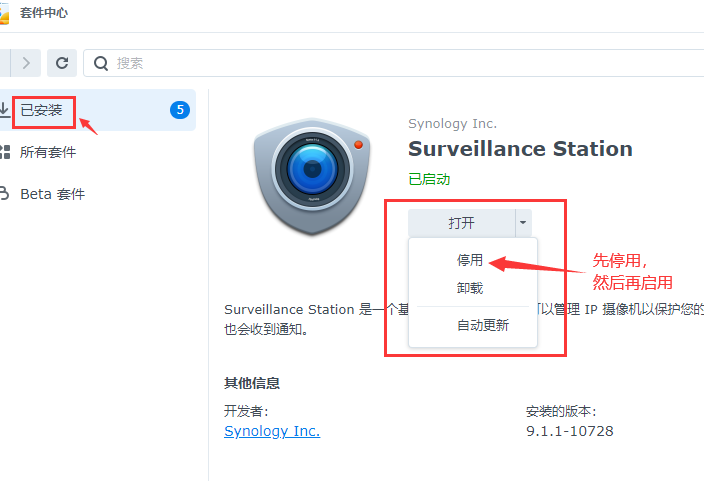 四,停用SurveillanceStation套件,再启用并打开SurveillanceStation套件查看授权