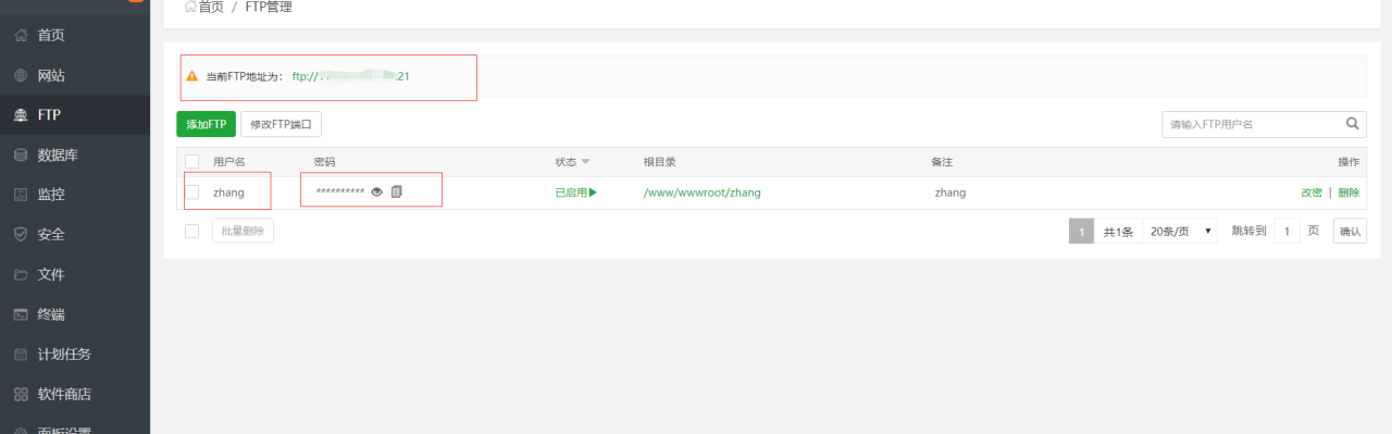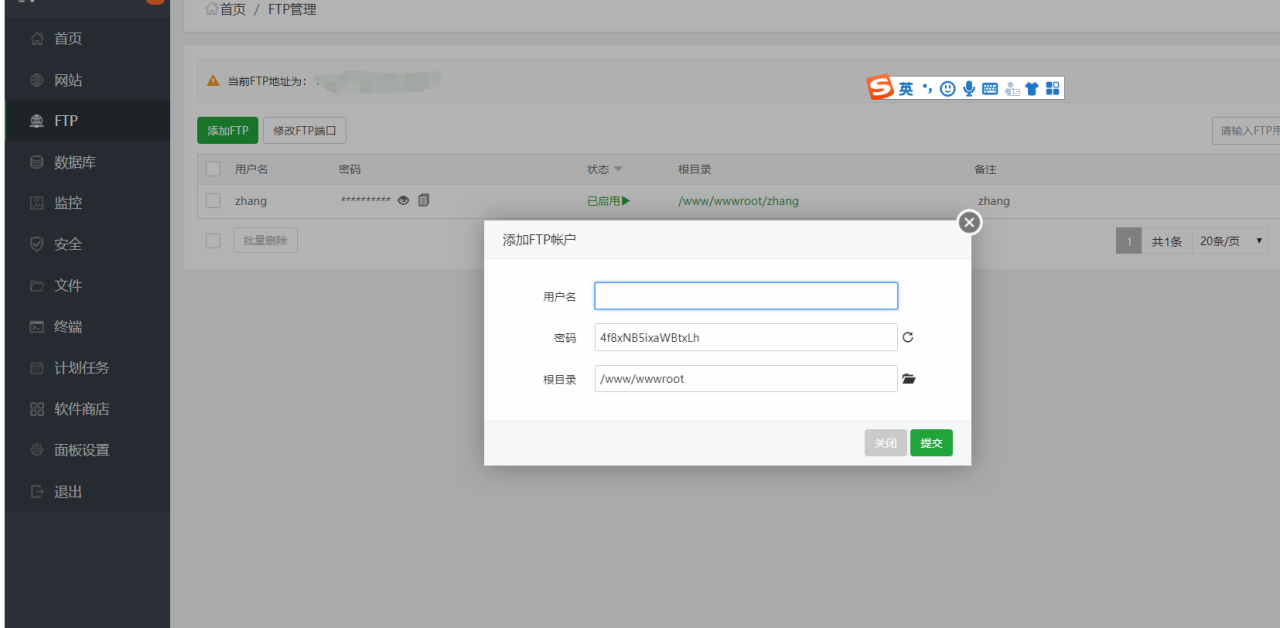 第二步,点击宝塔面板上的ftp,进入ftp配置界面。点击添加ftp按钮,配置ftp账号名,密码和文件上传到centos7服务器中的位置。