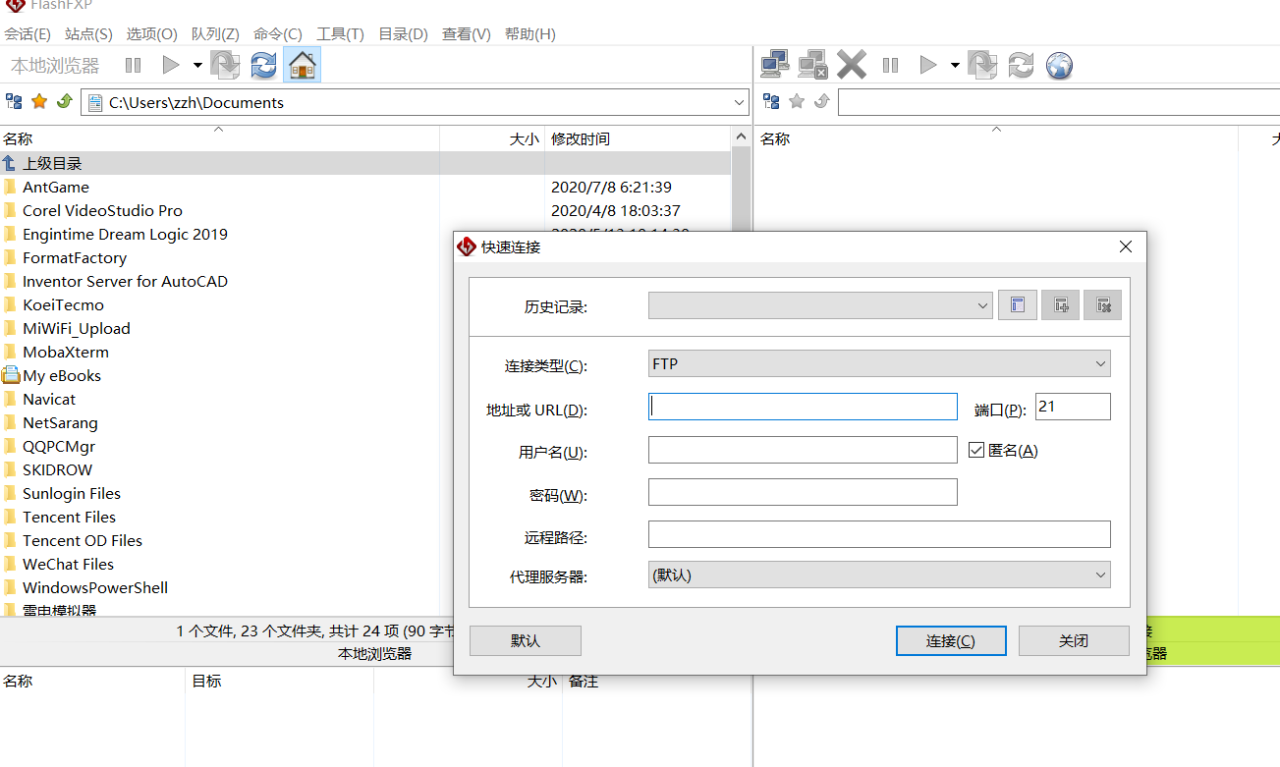 输入URL,用户名和密码点击链接可以连接到我们的ftp服务器(用户名密码等信息在宝塔面板的下ftp中)
