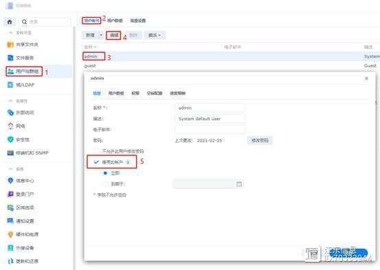 b、禁用admin账户:控制面板——用户与群组——用户账号——“选择admin”编辑——停用此账户
