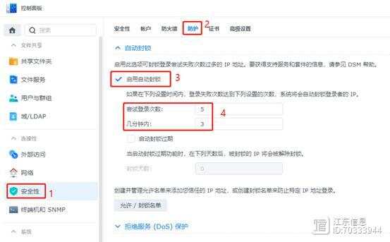 a、自动封锁IP:能有效防御账户、密码爆破攻击,建议设置成3分钟内密码错误5次,将对IP进行封锁。