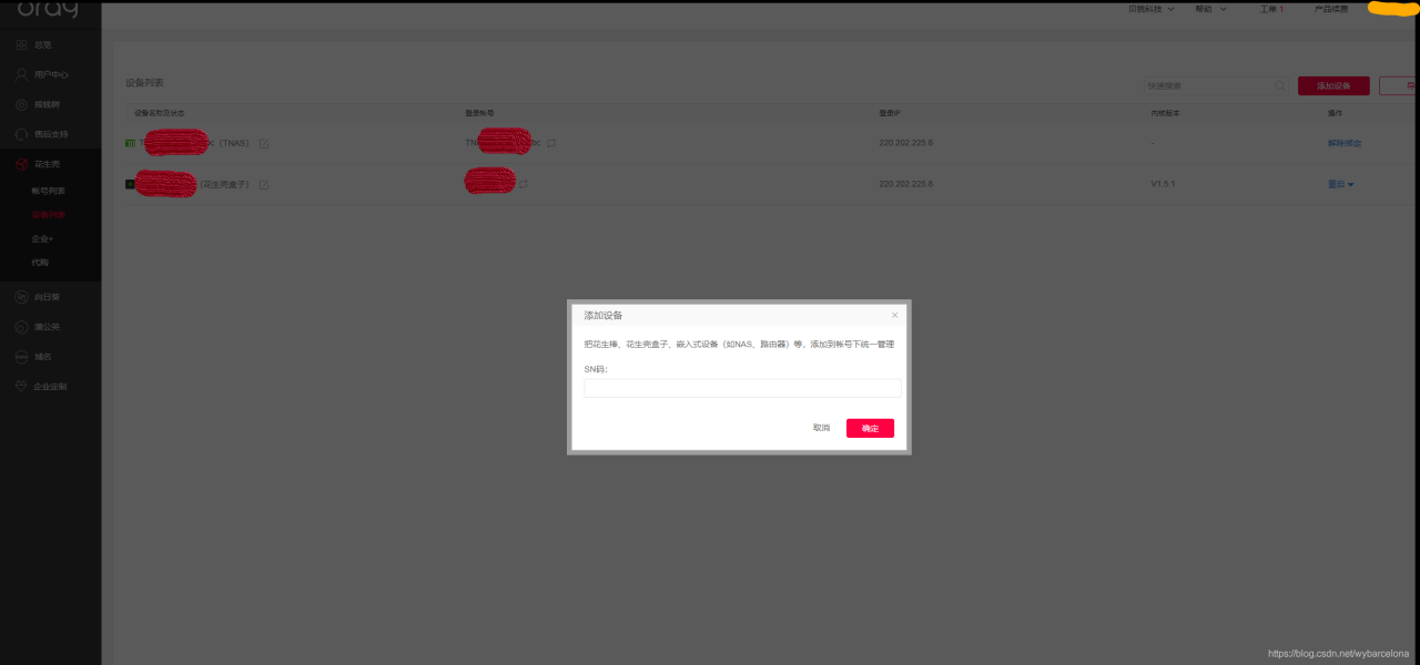 此时我就咨询了oray技术人员,是否可以使用我已有的oray账号,因为我已有的账号拥有注册的好记的域名,他们说可以,然后我就尝试了他们提供的方法,如下图所示,通过SN码添加设备