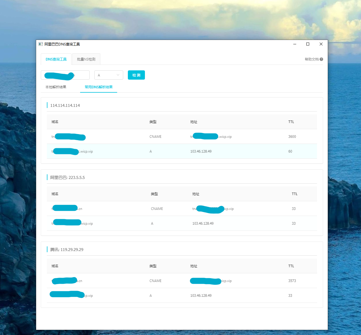 然后通过DNS检测工具检测都映射成功了,很开心