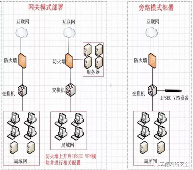 鉴于网关类设备基本都具备 IPSECVPN功能,所以很多情况下都是直接在网关设备上启用 IPSEC VPN功能,也有个别情况新购买IPSEC VPN设备,在对现有网络没有影响的情况下进行旁路部署,部署后需要对IPSECVPN设备放通安全规则,做端口映射等等。