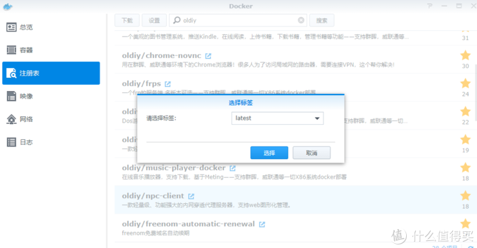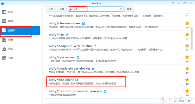 安装完成后打开docker,点击注册表,搜索oldiy(这里感谢oldiy大神)找到oldiy/npc-server 双击安装