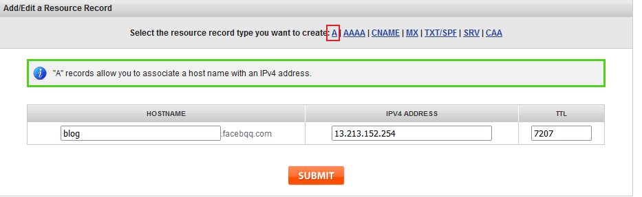 将域名和云服务器的公共IP做DNS解析,选择A类解析。示例如下: