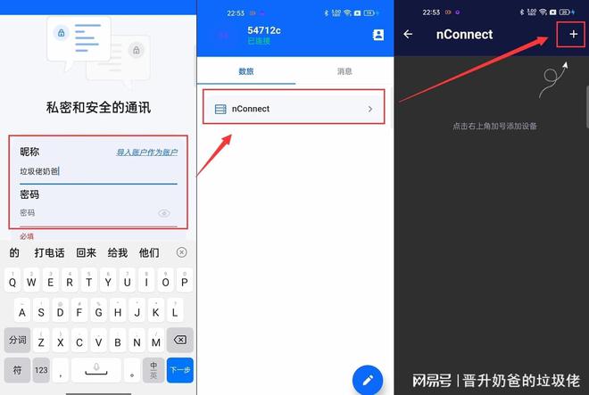 ▼在手机APP上进行注册,找到nConnect,在点击右上角的『➕』唤起相机扫描NKN WEB页面首页的二维码即可完成绑定。