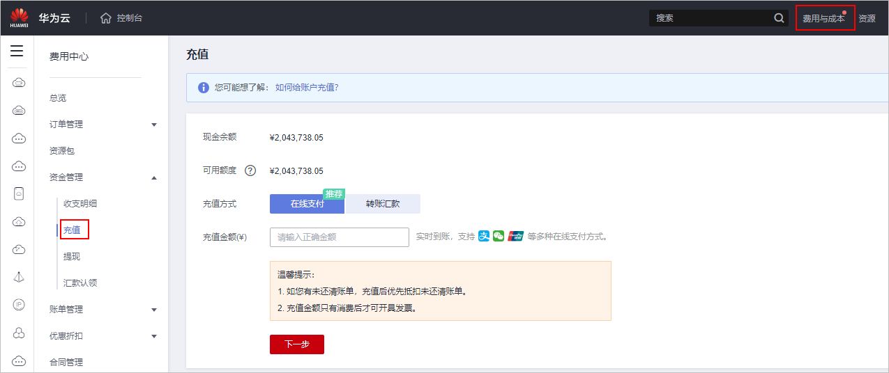 在控制台界面上方,单击“费用与成本”,选择“ 资金管理 > 充值”,为帐号充值。