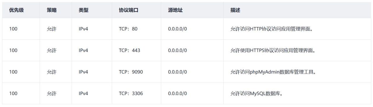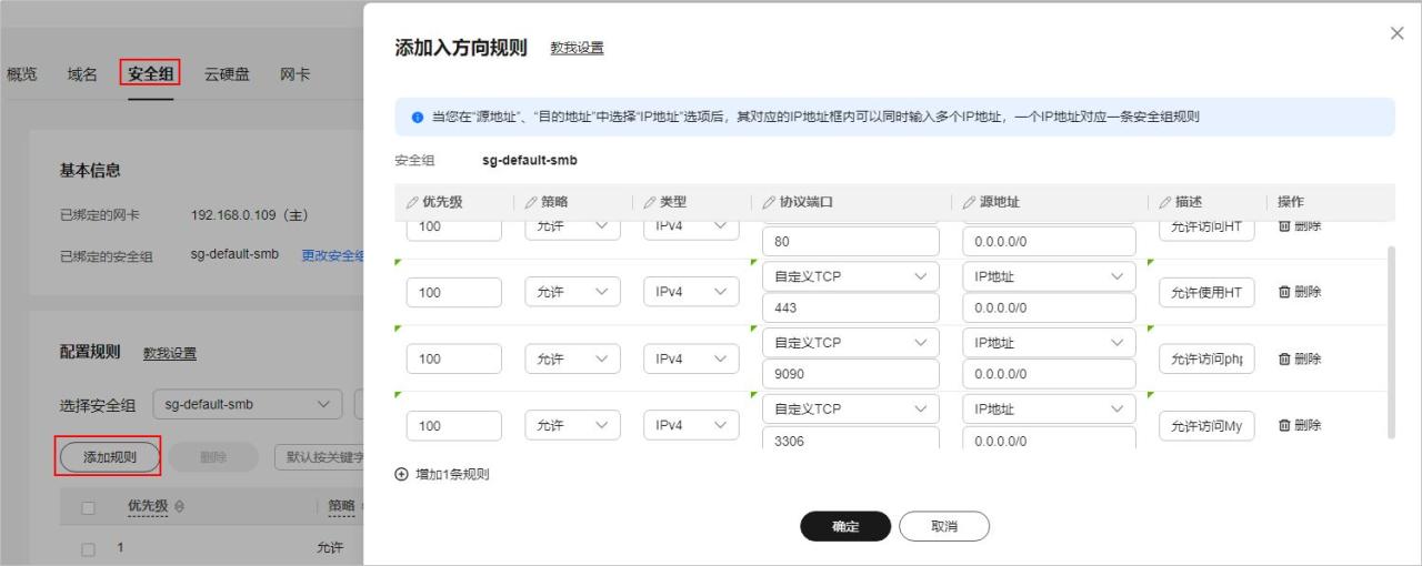 ③ 选择“安全组”页签,单击“添加规则”,添加如下规则,单击“确定”。