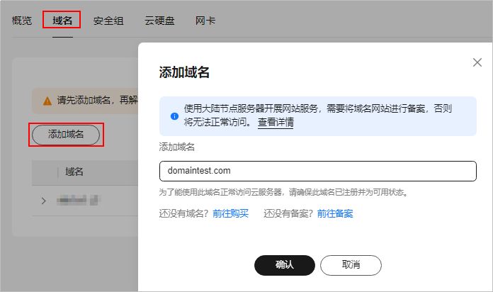 请为服务器添加并解析域名保护网站安全,并且方便您的用户访问网站。如果您仅为个人开发或测试使用,可以不添加域名。