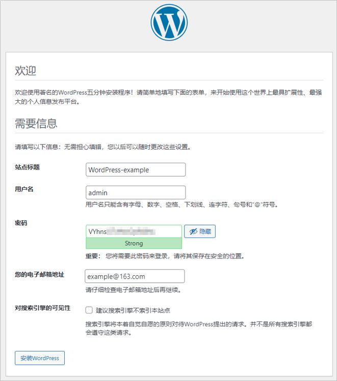 3.设置网站标题、WordPress管理员用户名、密码和邮箱, 单击“安装WordPress”。