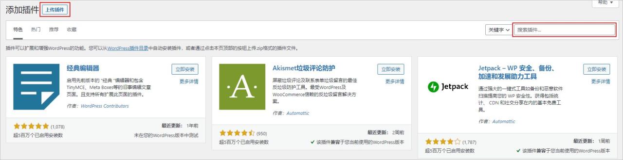 ¡您可以安装WordPress插件库中的插件:右上角搜索插件关键词或者根据分类选择插件。