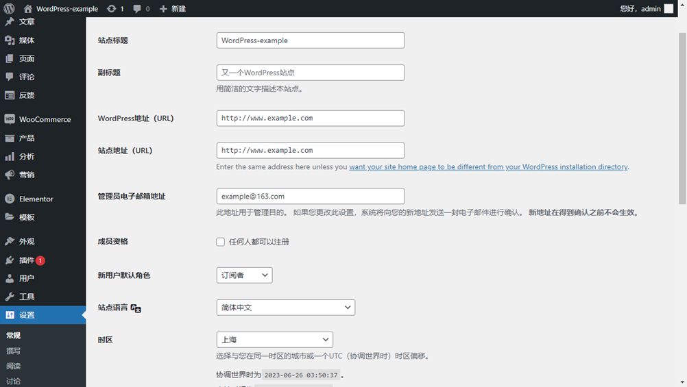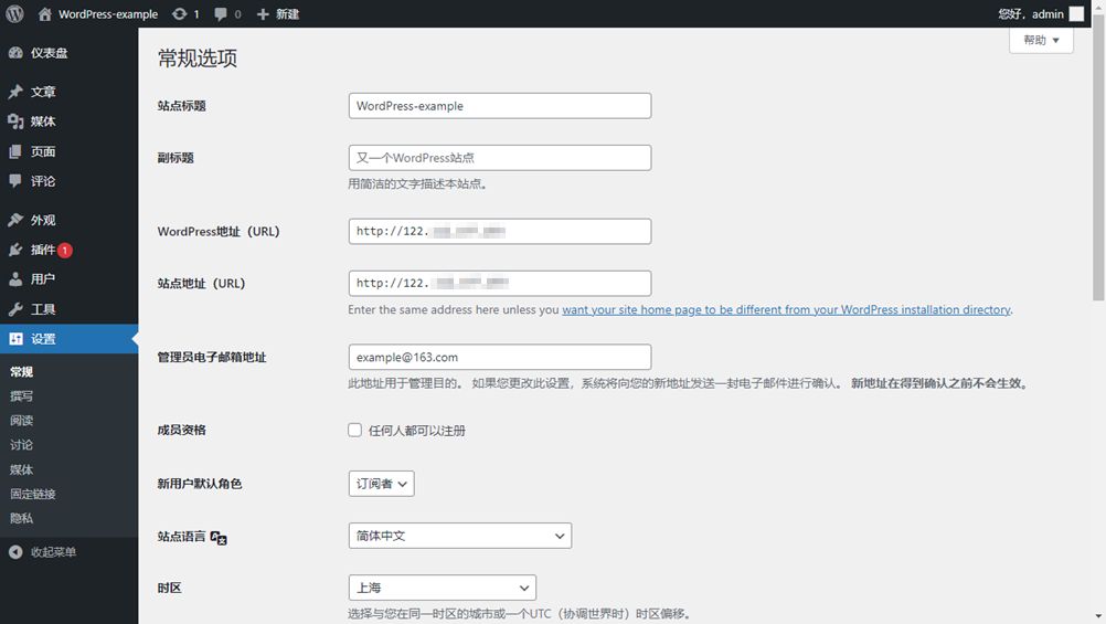 在WordPress后台管理页面,选择“设置 >常规”,将WordPress地址和站点地址设置为新的域名,保存后生效。