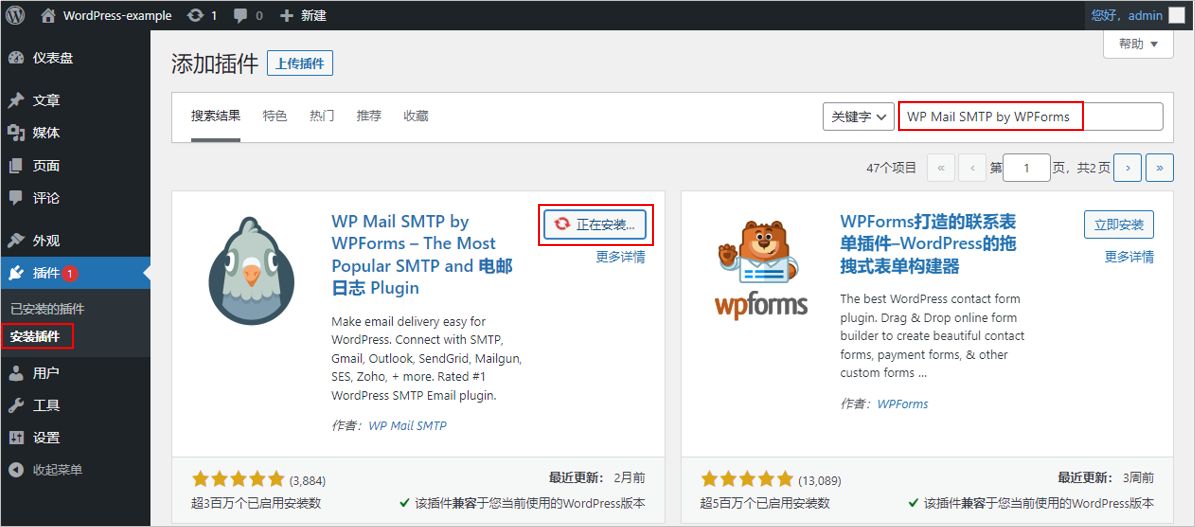 b.搜索关键词WP Mail SMTP,单击WP Mail SMTP插件上的“立即安装”按钮,完成安装后,单击“启用”。