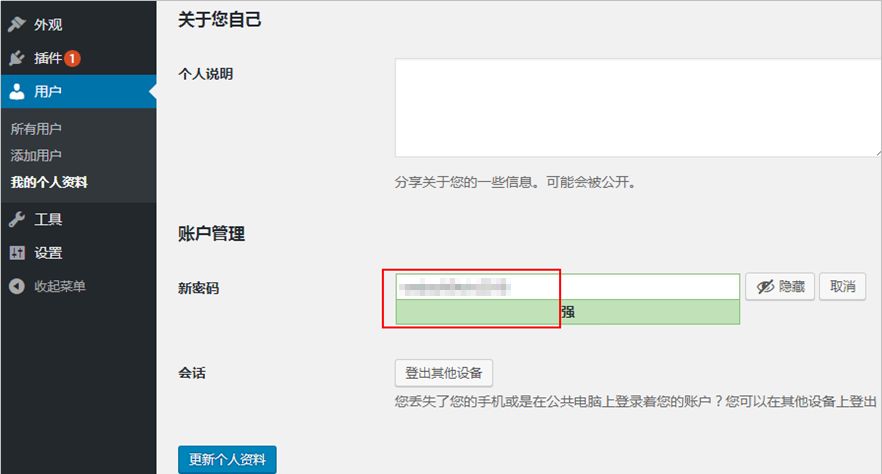3.选择“用户 > 我的个人资料”,设置便于记忆的密码,单击“更新个人资料”。