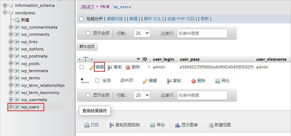 3.在“wordpress”数据库下选择wp_users表格,单击“编辑”。