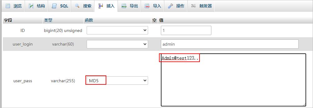 4.编辑WordPress管理员的账号密码,本例修改密码为“Admin@test123..”。