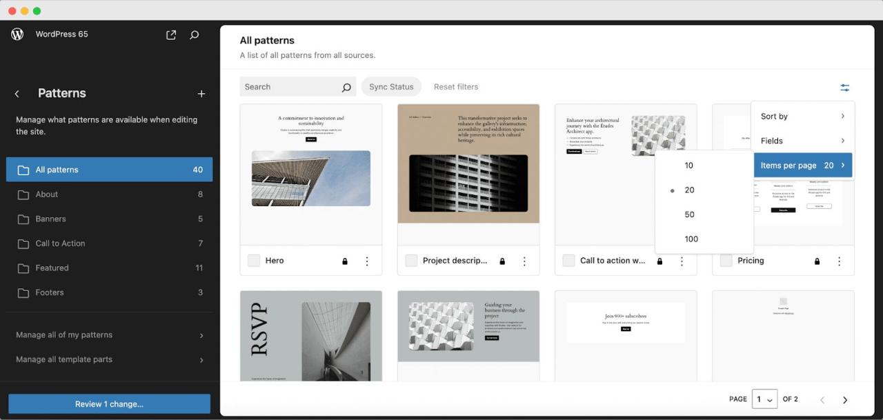 使用 WordPress 6.5 的数据视图选项,你可以轻松找到所需内容并按照你想要的方式组织它。你将收到页面、模板、模式和模板部分的数据视图。这进一步允许你以表格或网格格式查看数据,并能够切换字段并执行批量更改。现在,你网站的每个组件都包含一个信息和数据库。
