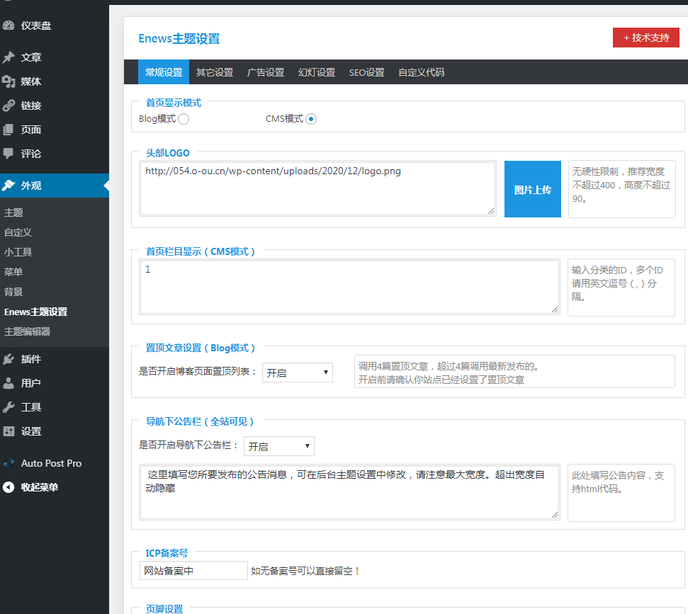 一般设置:CMS模式、blog模式、网站logo上传、首页栏目显示(CMS模式)、文章顶栏(Blog模式)、全站公告牌、ICP记录号、页脚代码;