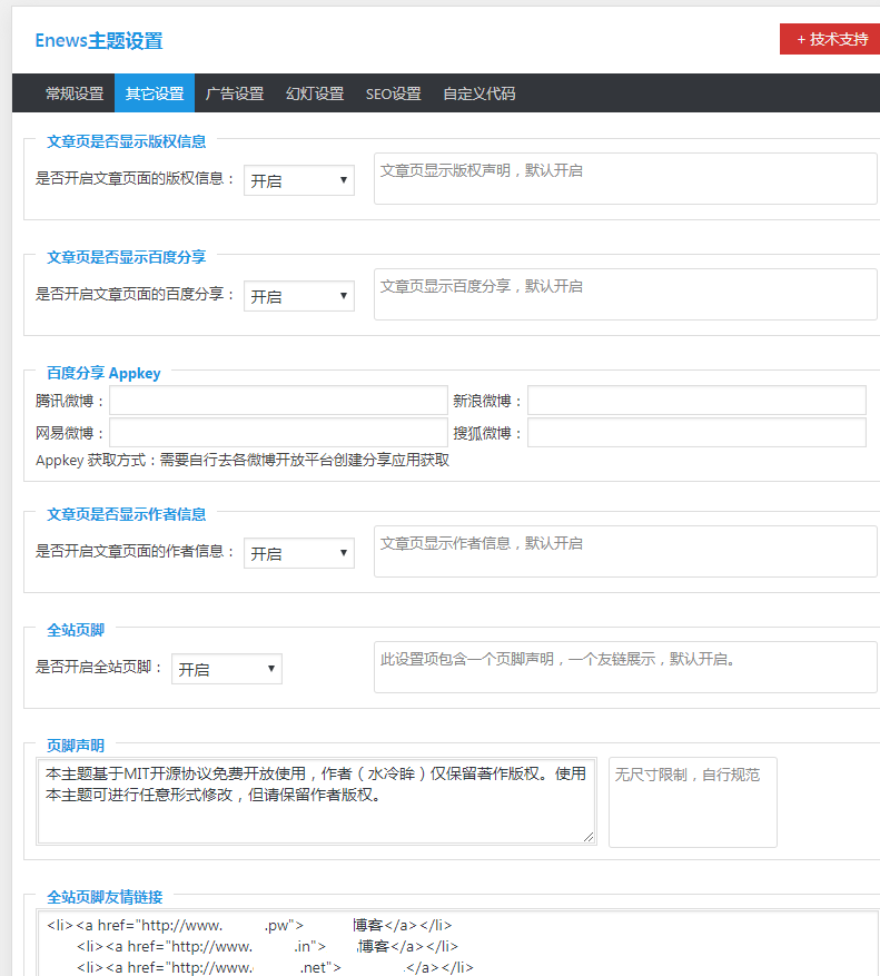 其他设置:文章页面(版权、百度分享、作者信息)打开关闭,百度分享APPkey,全站页脚打开关闭(包括声明和友情链接);