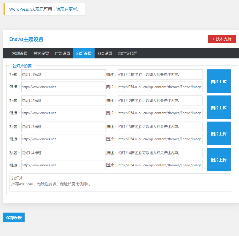 幻灯片设置:后台设置标题、描述、链接,支持后台直接上传图片;