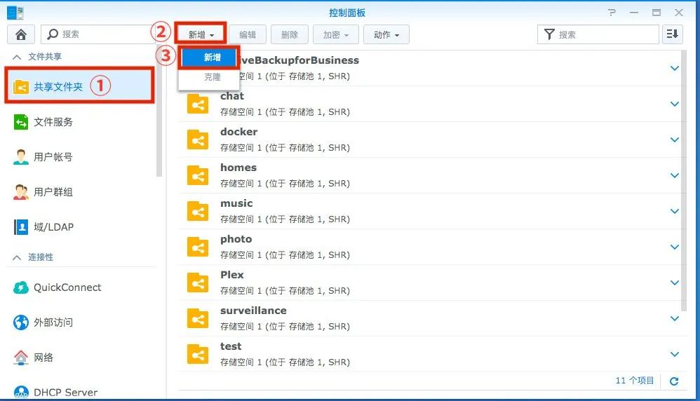 首先,您需要创建一个只属于存储Time Machine备份文件的共享文件夹。然后登录DSM,进入【控制面板】>【共享文件夹】>【新增】>【新增】