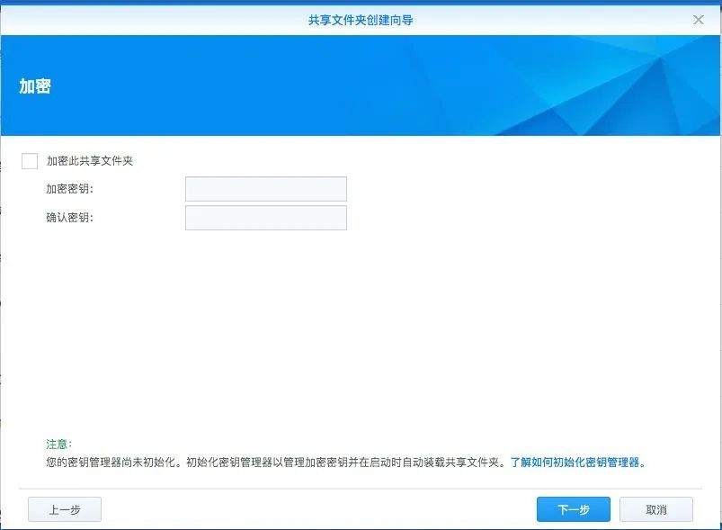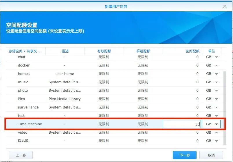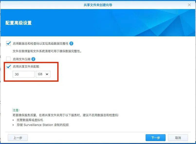 下一步进行配置高级设置,这里可以给共享文件夹设定文件夹配额,以免备份Mac占用太多NAS容量