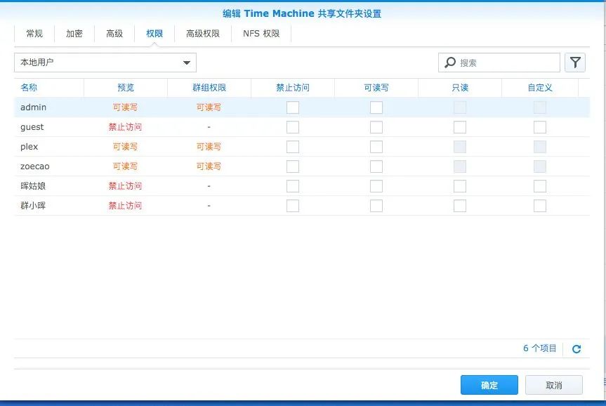 接下来,再为NAS账户勾选是否拥有访问Time Machine备份文件夹的访问权限