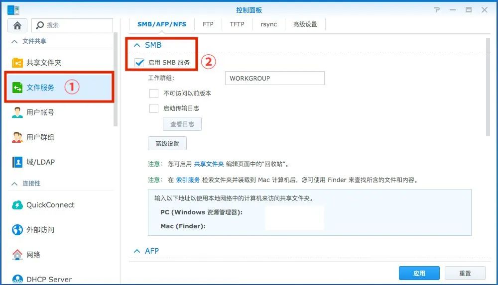 Time Machine同时支持SMB和AFP,这里的macOS使用SMB作为默认协议,如果有些小伙伴只支持AFP,请勾选【启用AFP服务】(如果不清楚的,可以两个都勾选…)