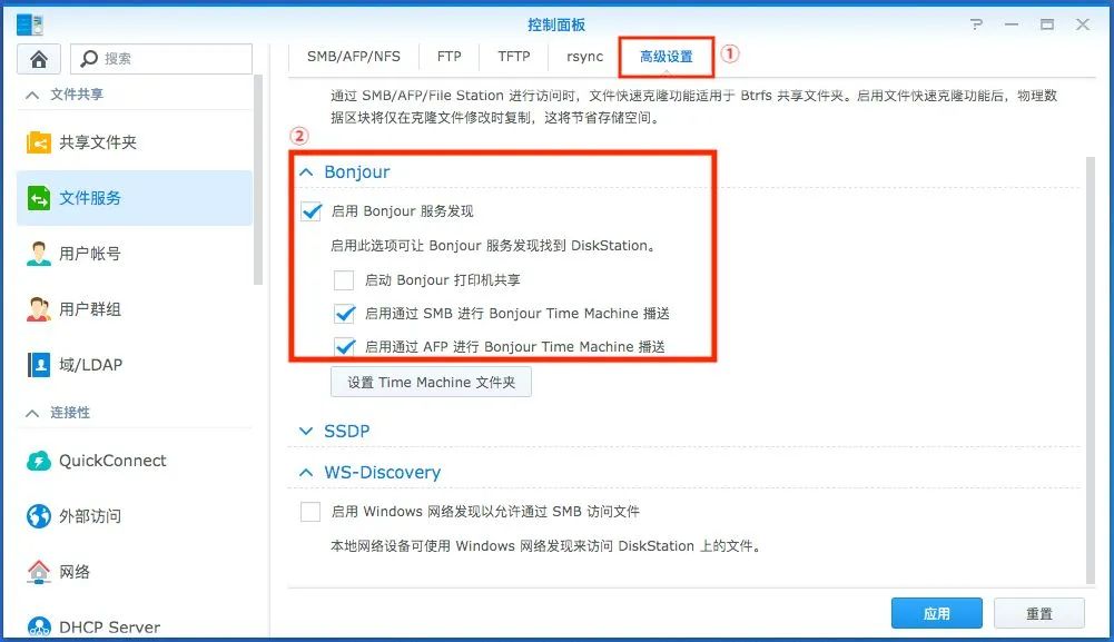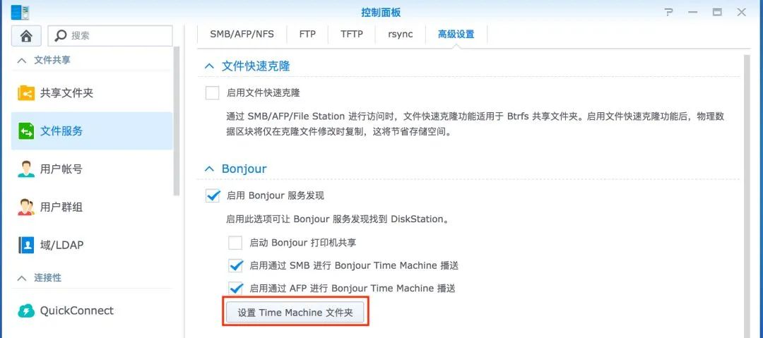 然后进入【高级设置】,勾选【Bonjour】,开启通过SMB、AFP进行Bonjour Time Machine播送