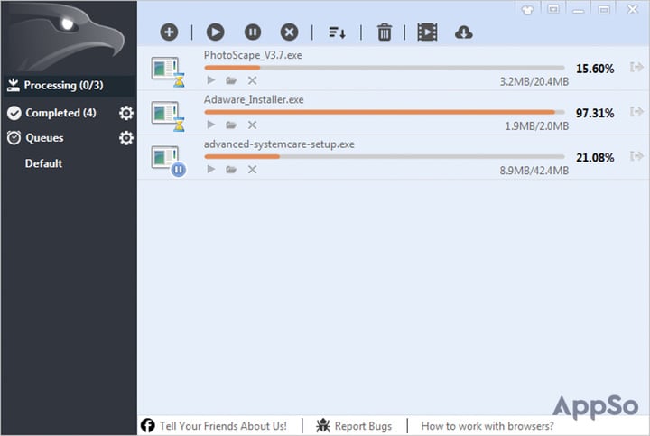 EagleGet 是 Windows 平台上一款简洁、强大的下载软件。直观的界面,稳定快速的下载,使得它成为许多 Windows 用户的首选。它支持 Chrome、Firefox、Opera 和 IE 等主流浏览器,使用多线程加速下载技术,支持断点续传,甚至还能自动检测网站上的媒体内容,从而进行下载。缺点就是不支持磁力链接和 BT(BitTorrent)下载。
