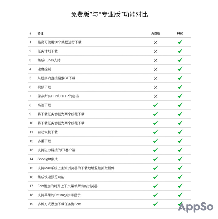 目前 Folx 5 在官网售价为 19.95 美金,提供一台 Mac 买断服务,再加 10 美金提供终身更新保证服务。家庭包支持 3 台 Mac,价格则为 38.95 美金。免费版和 Pro 版提供的功能区别,可以看下表: