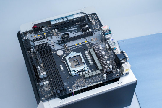 我拿出了一个M-atx的主板放在这个机器上,就可以看下大小,真的比想象中的小太多: