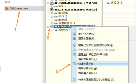 打开后,我们格式化一下U盘,选择U盘这个,点击右键,快速分区: