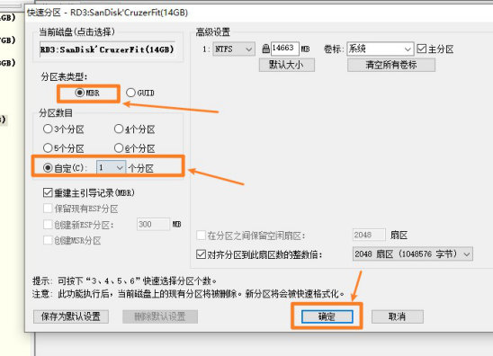 4、然后,我们选择MBR这个分区表,点击自定1个分区,然后点击确定,进行格式化:
