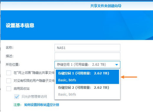 3、然后,我们新建共享文件夹,由于我是单盘使用,有多个存储空间,所以建立共享文件夹的时候,还是要注意下,选择自己需要的存储空间: