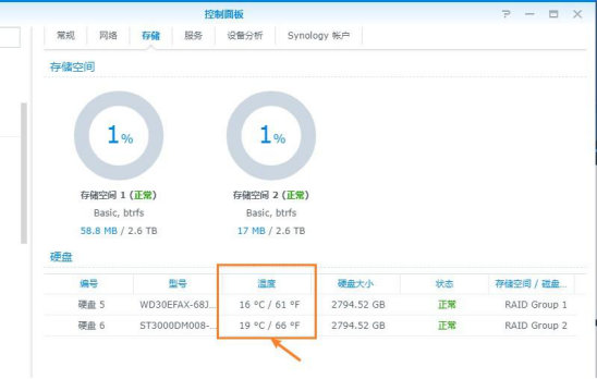 以至于硬盘测出的温度只有16~19 度,可以看到红盘的温度比普通硬盘的温度更低: