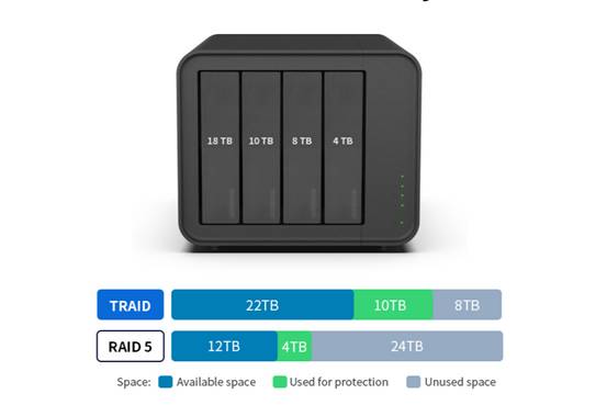 在数据存储领域,稳定性是至关重要的因素。铁威马F4-424 Pro采用了先进的散热技术和冗余电源设计,有效降低了设备故障的风险。同时,该设备支持RAID技术,可以创建多个磁盘阵列,提高数据的可靠性和安全性。即使其中一个硬盘出现故障,用户也可以通过更换硬盘并恢复数据的方式,确保数据不丢失。更有独家研发的TRAID,更灵活更充分利用磁盘空间。