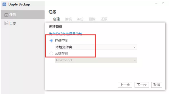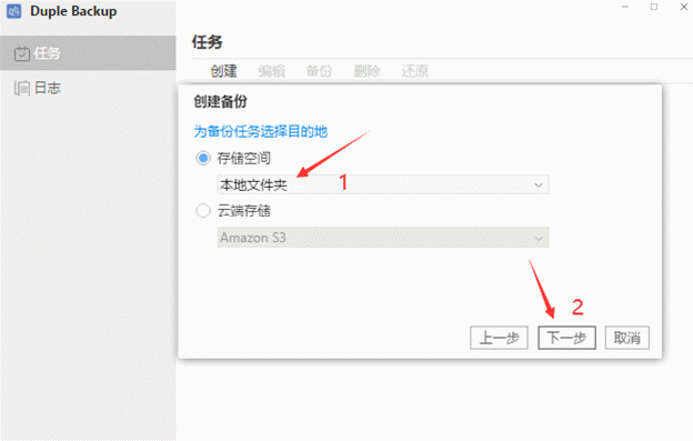 3.备份文件夹;选择文件夹,点击下一步为备份任务选择目的地,可以本地存储也可云端存储。