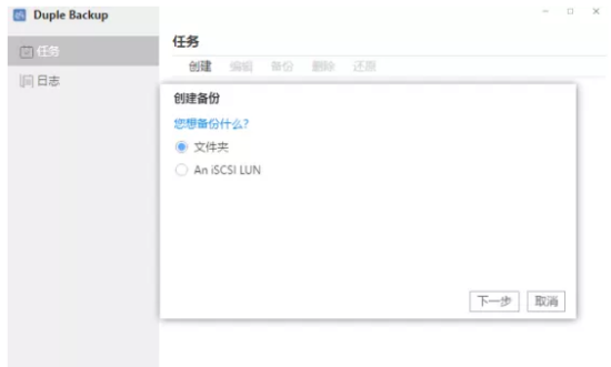 2.打开Duple Backup;单击桌面打开Duple Backup,默认新增数据备份任务,这里可以选择备份文件夹或者An iSCSI LUN。
