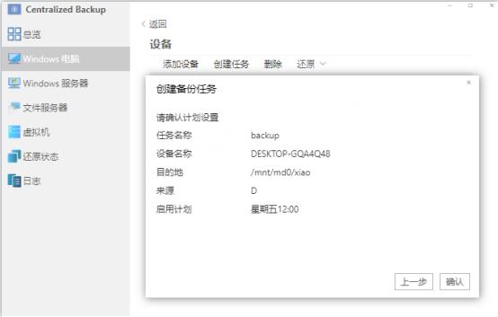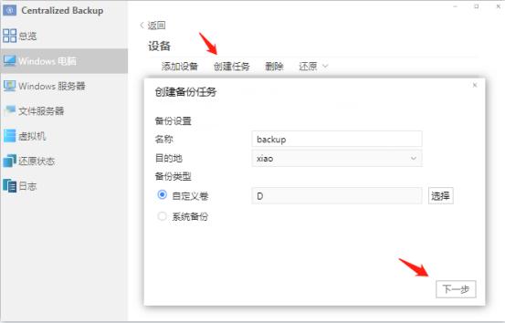 6.连接成功后,可在NAS中查看添加成功的PC,选中PC后点击创建任务,设置备份名称、备份目的地以及备份类型,点击下一步;