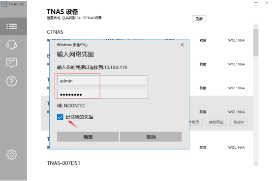 4.输入NAS中有权限访问这个共享文件夹的账号和密码,并勾选“记住我的凭证”;