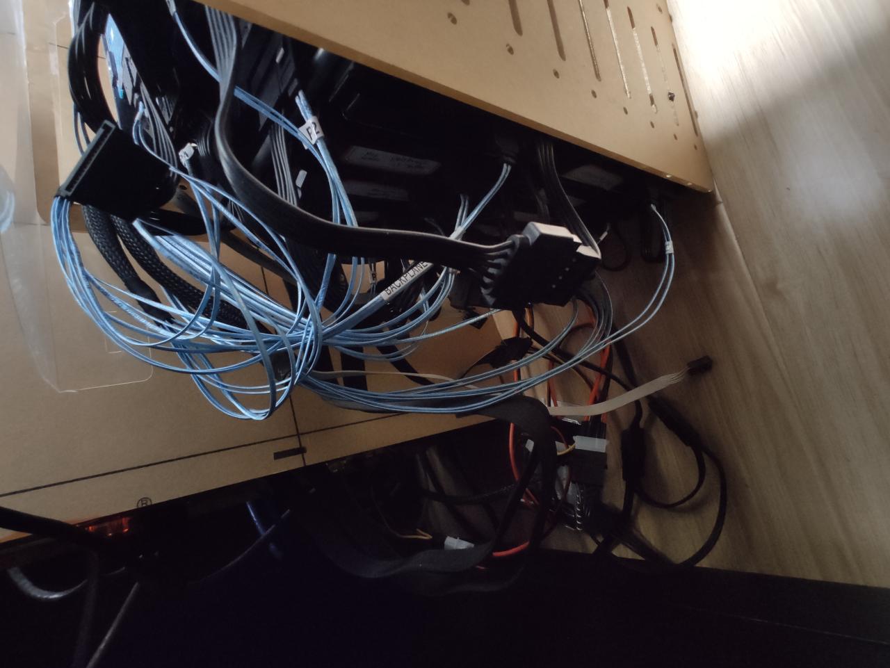来!看看我现在这个硬盘柜的状态,不仅仅是装满了,而且还不够放了23333,我准备把之前的那个硬盘柜在拿出来,做一个子硬盘柜!现在还没有测试的就是不知道这个扩展卡下面还能不能再挂一个扩展卡,不过如果不可以的话,我可以直接把8087转SATA插到前面去,反正现在这两个扩展卡上面还有大概3个8087口!